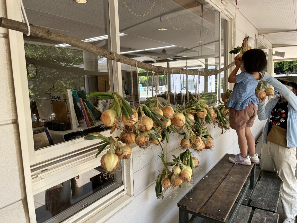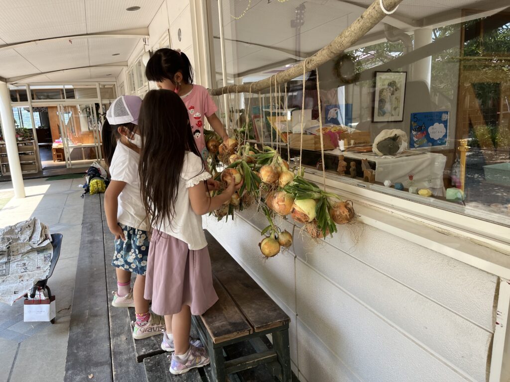 大きなまんまるいタマネギ、園に持ち帰って軒下に干しましたよ。来月、カレーを作って食べようね。