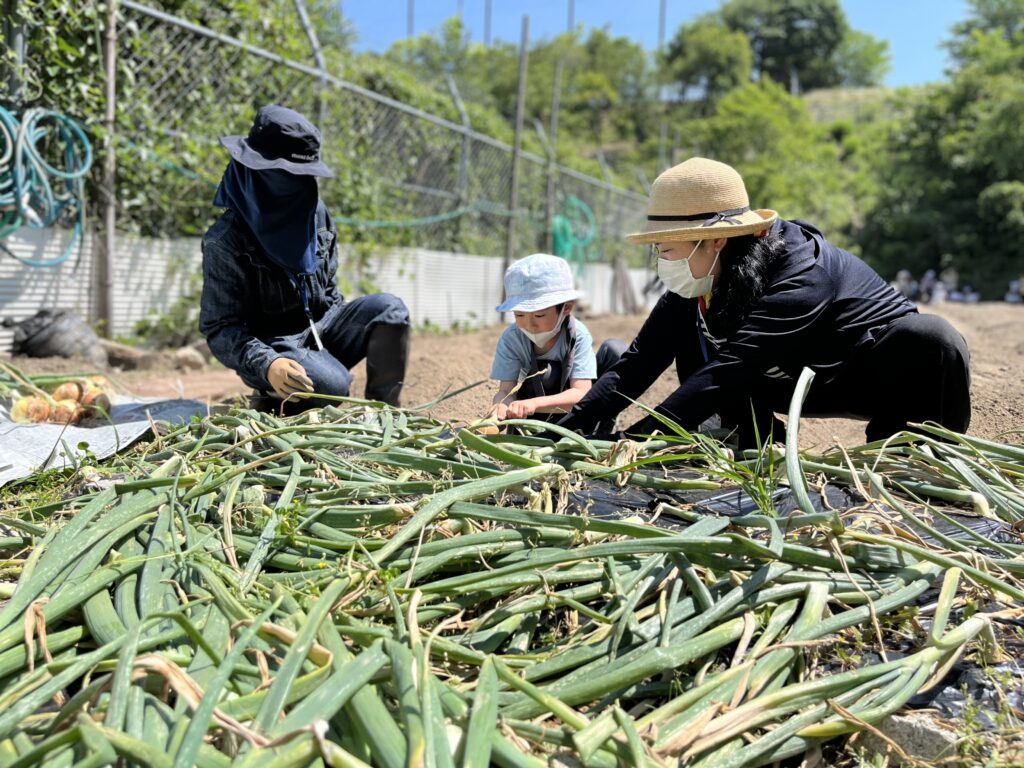5月24日(火)、ゲーンス農園サポーターズさんたちが育ててくださったタマネギを、年長児たちが抜かせてもらいました。年長児さんたちが昨年度に植えて春に収穫しようとしたタマネギさんたちが、実はカルガモさんに食べられてしまったことを受け、サポーターズさんたちがこの機会を与えてくださいました。