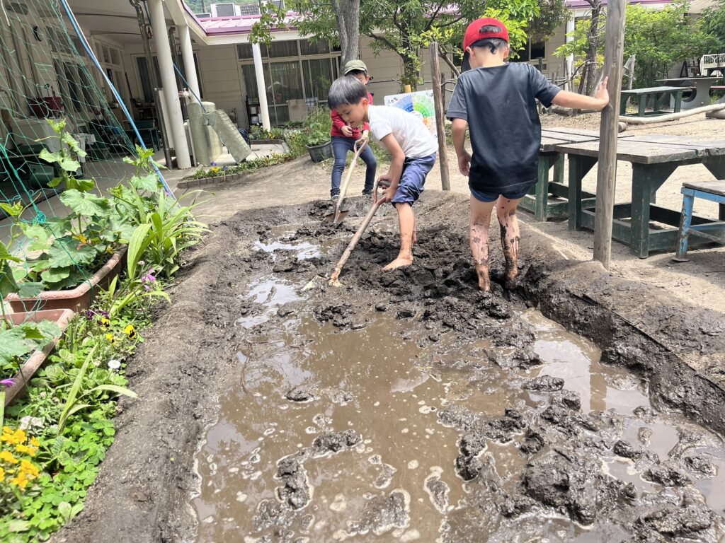 もうすぐ田植えの季節だね、僕たちも代かきを手伝うよ!と、クワやシャベルを手に、ゲーンス田んぼをやわらかく、田植えができるように作業もしてくれました。