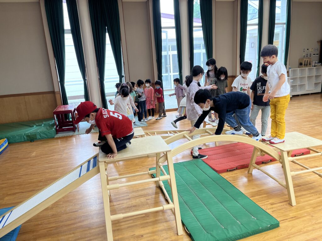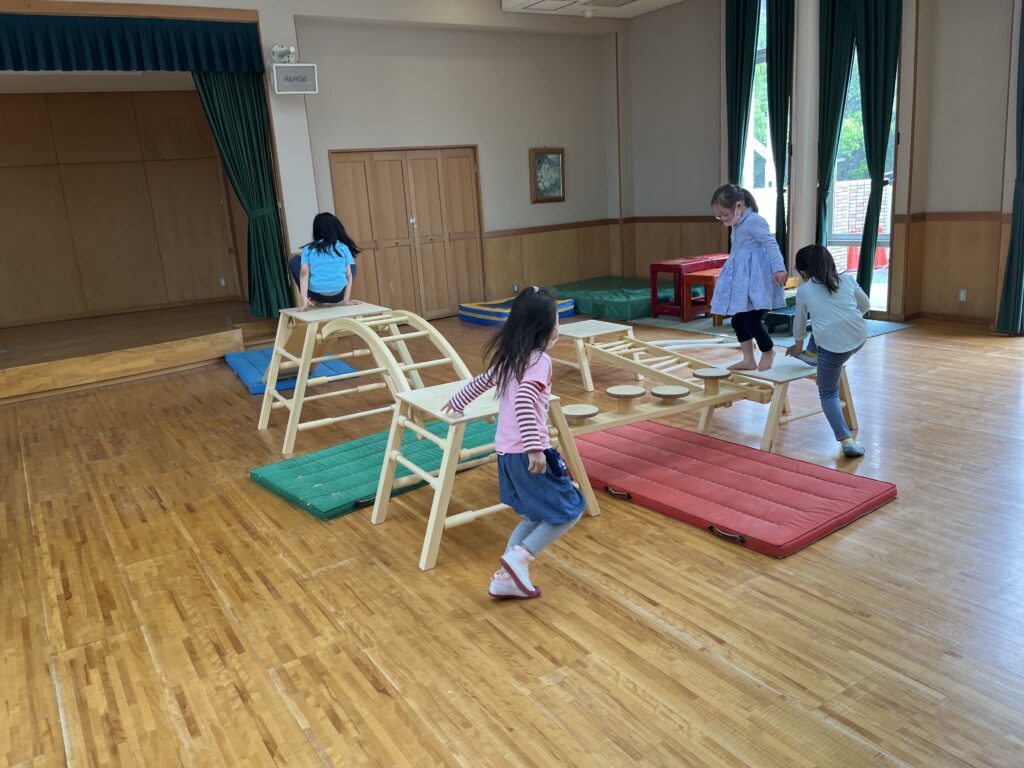 たっぷりの時間、みんなの分かち合いの時を過ごしたあと、ホールの遊具「シンキング、ぼうけんコース」の紹介。
