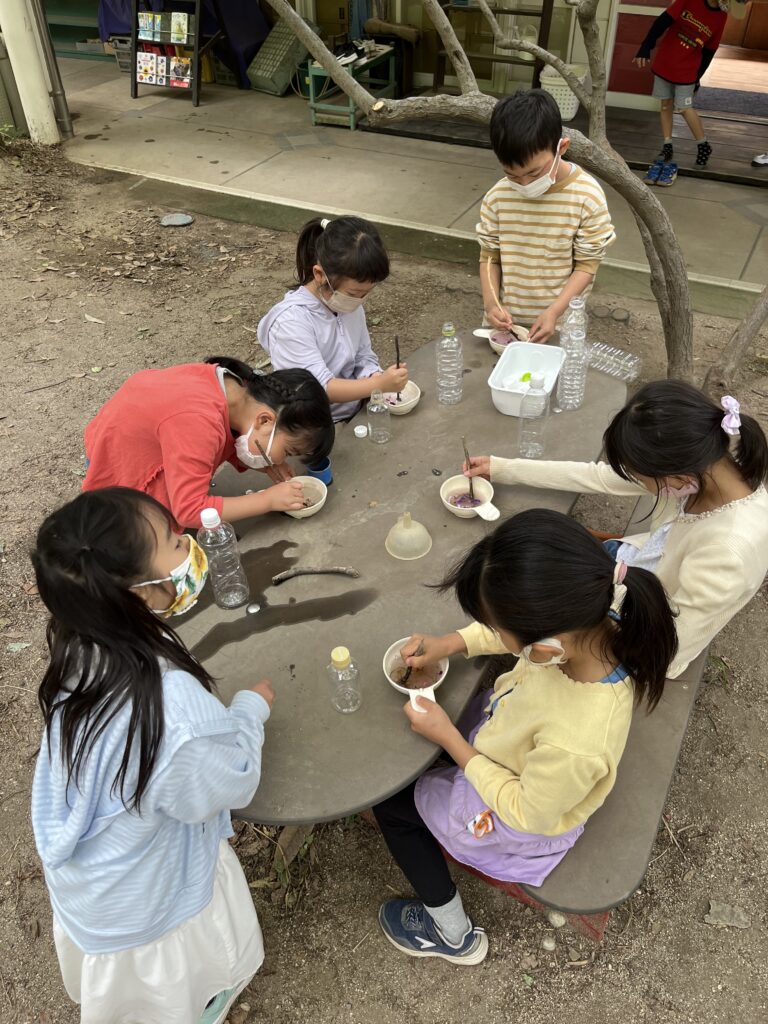 そのあとは、思い思いの場所で好きな遊びに夢中になり、あっという間の2時間でした。色水づくりは久しぶりだったのでしょうね!?科学者のように黙々と、取り組んでいましたね。
