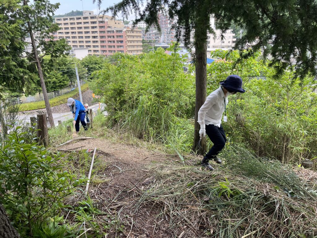 ここの、ヒマラヤ杉の下の草を刈ると、ひとクラスがシートを広げてお弁当を食べることができるくらいのスペースが生まれました。ここの広場に名前をつけて、親しみのある場所になるといいですね。