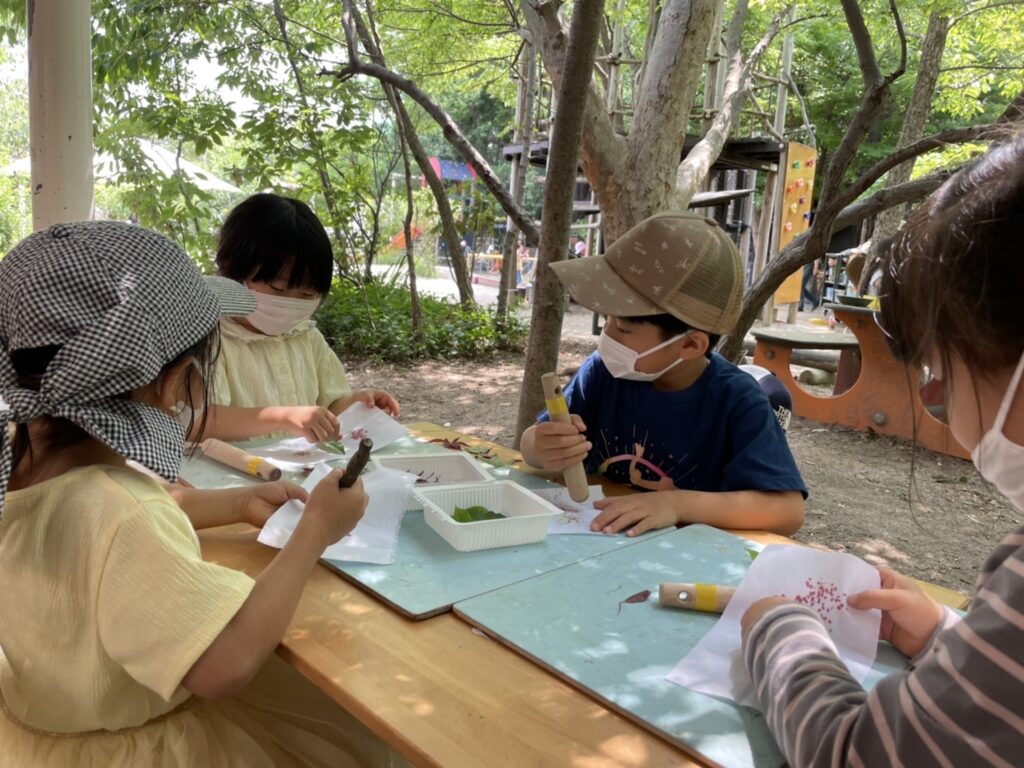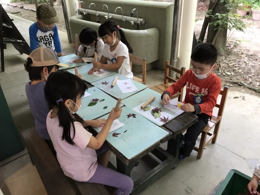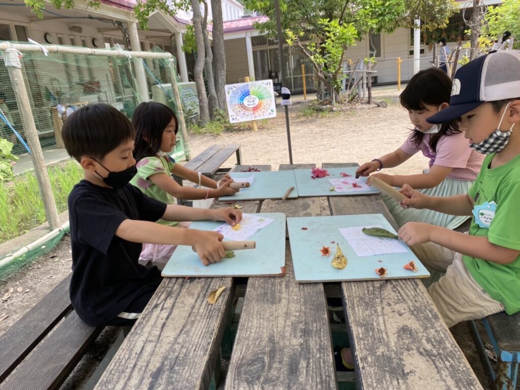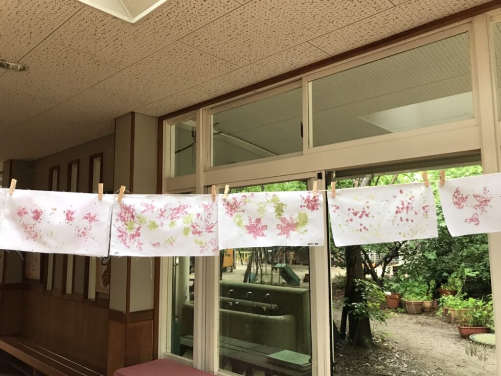 深まる緑の季節、さまざまな色や形の葉っぱに囲まれて過ごす日々。中には、秋でもないのに赤く紅葉したモミジもあります! 自然って不思議!!神様がくださったこの自然、これまでも木々の葉っぱでお料理したり、貼り絵をしたり、色水を作ったりして楽しんできましたが、白いハギレを用意して、葉っぱの色を叩いて染める遊びが、今盛り上がっています。