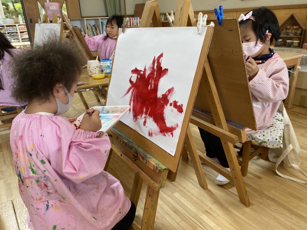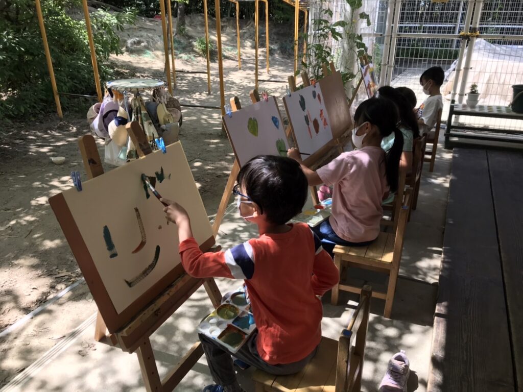 園生活の中で、描画や絵の具という素材とたっぷりふれあってきた年長児たち。6月は「混色」を思う存分楽しんでみることができるよう、いつもの絵の具ポットに加えて、たくさんのパレットを用意し、「あの色とこの色」「これは少しでこっちはたっぷり」「あれもこれも!」などなど、さまざまな原色、清色が濁色になる過程を楽しみ、そこで生まれた新しい(?)、不思議な(?)色で、アトリエ・テラスにて、アートしています!