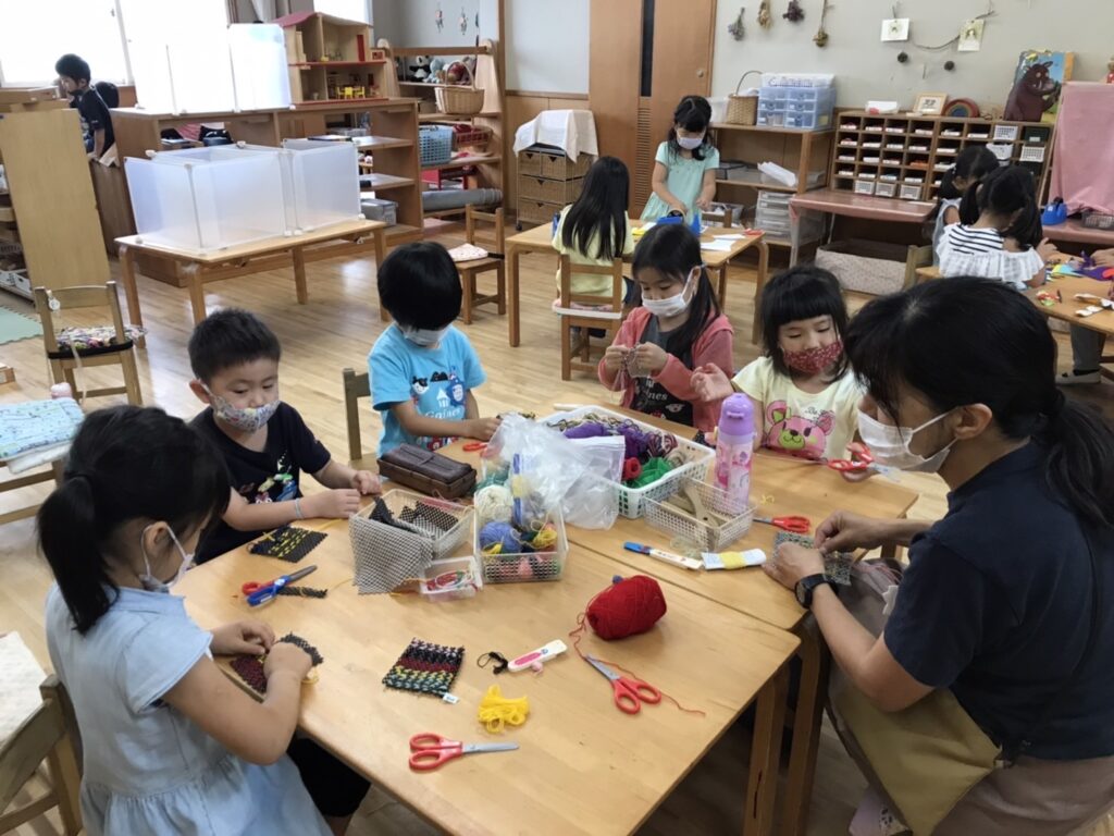 「どの色の糸にしようかな〜」と糸選びから。「玉結び出来るよ、してあげる!」友だちを気にかけ、助け合いながら編み物に夢中になっています。世界に一つだけのかばんが出来上がり!