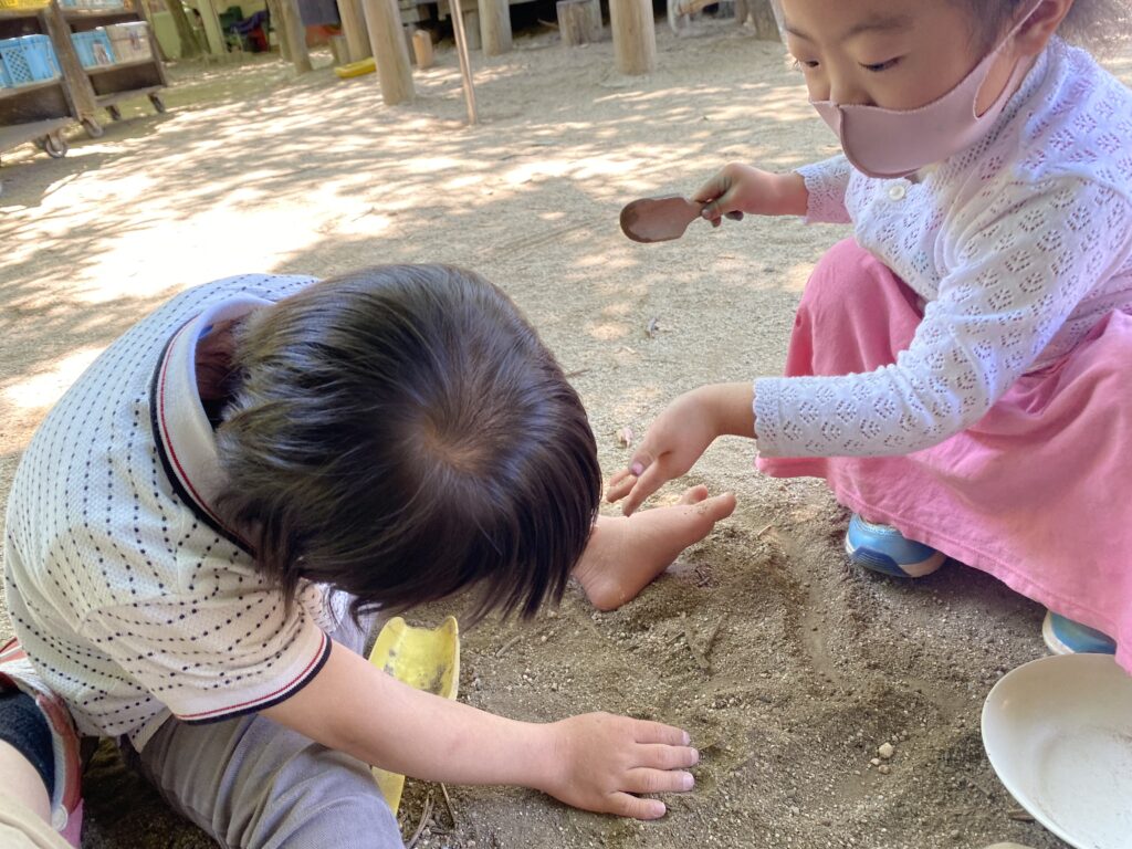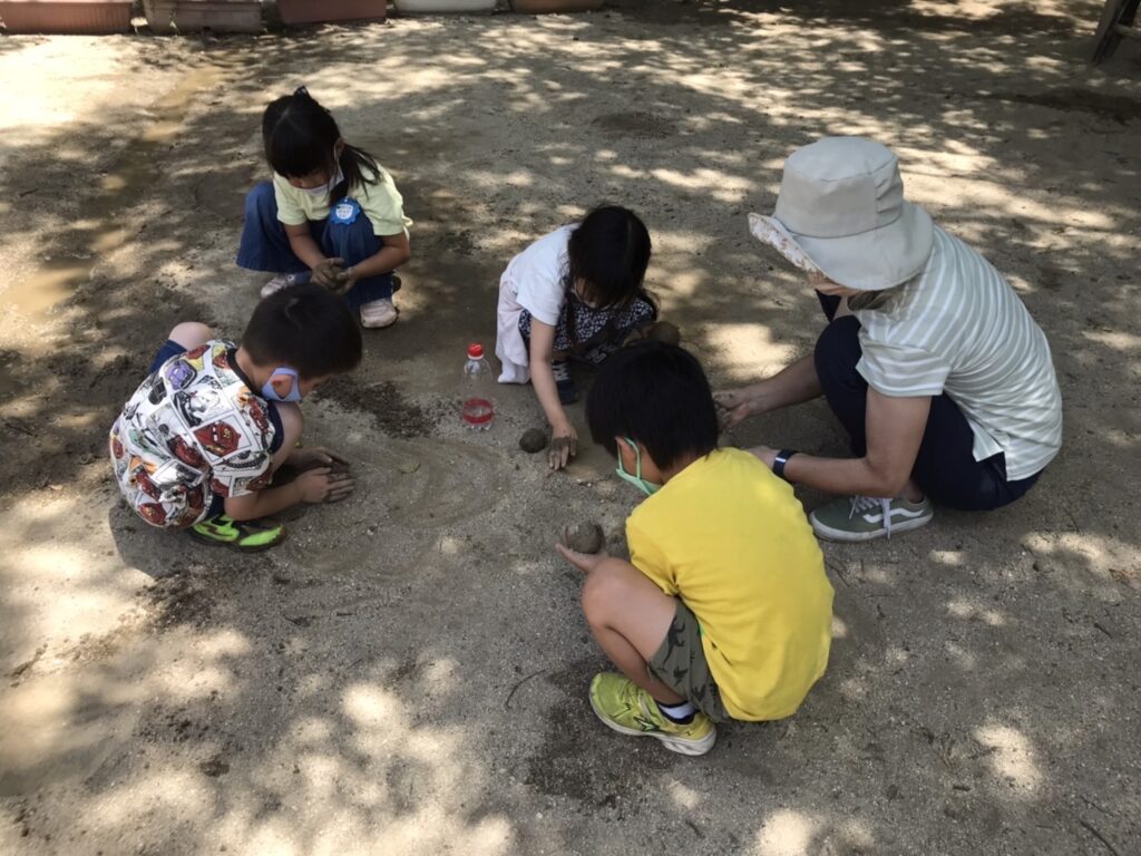 「水注いでくる!」「さらこな作ってくる!」「こっちにさらさらの砂あるよ!」と繋がりあって声を掛け合いながら夢中で作っています。最後は手の平で磨いて、光る泥団子の完成!名人がたくさんいます。
