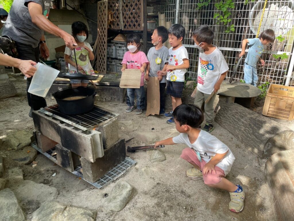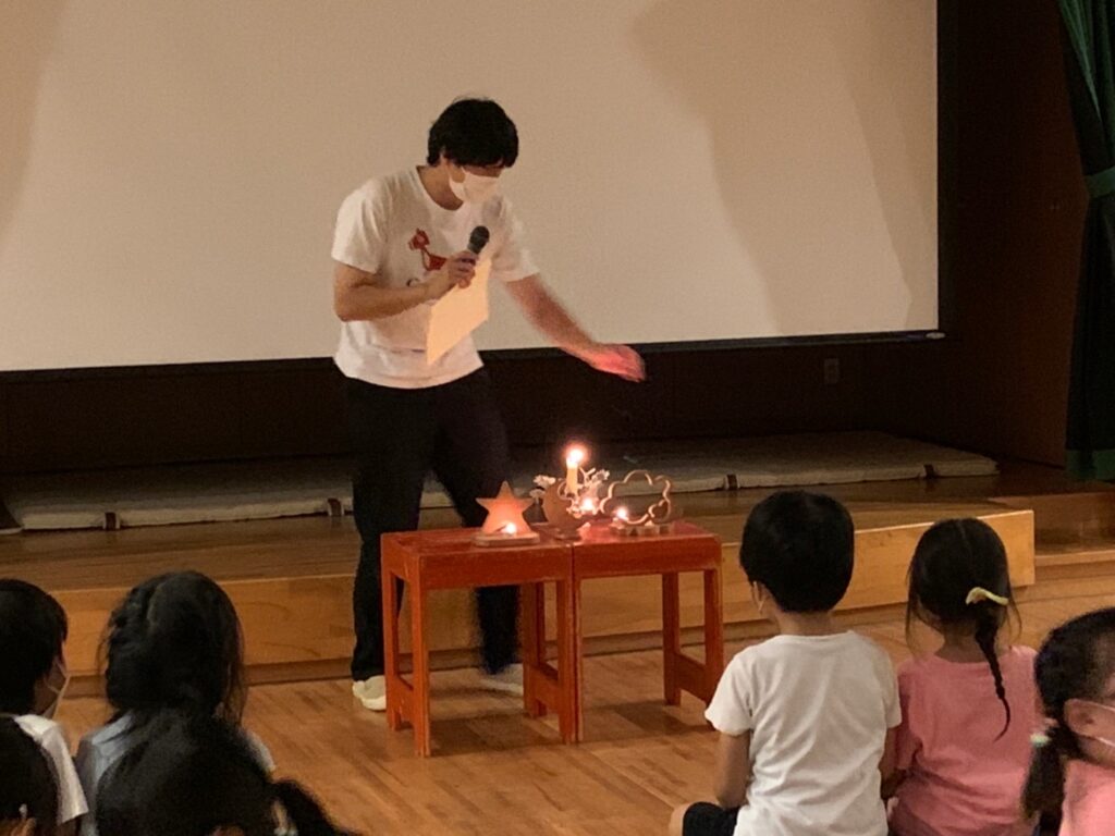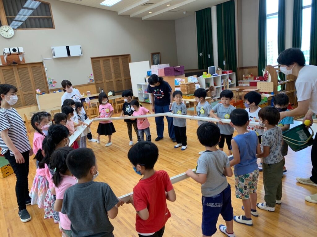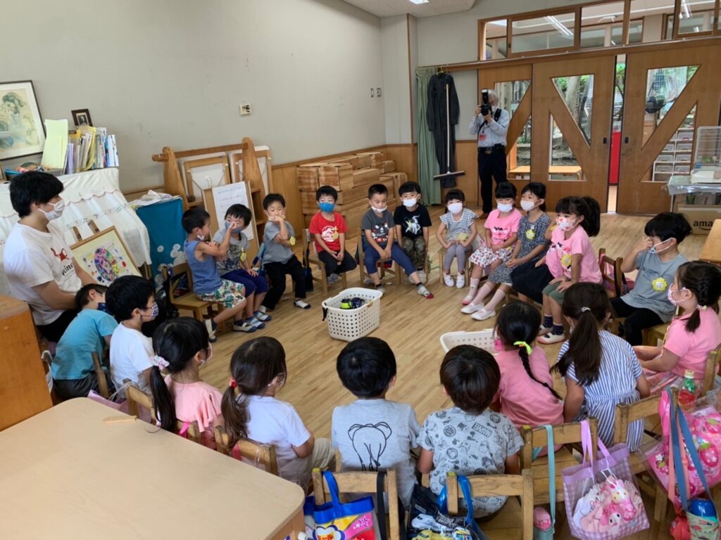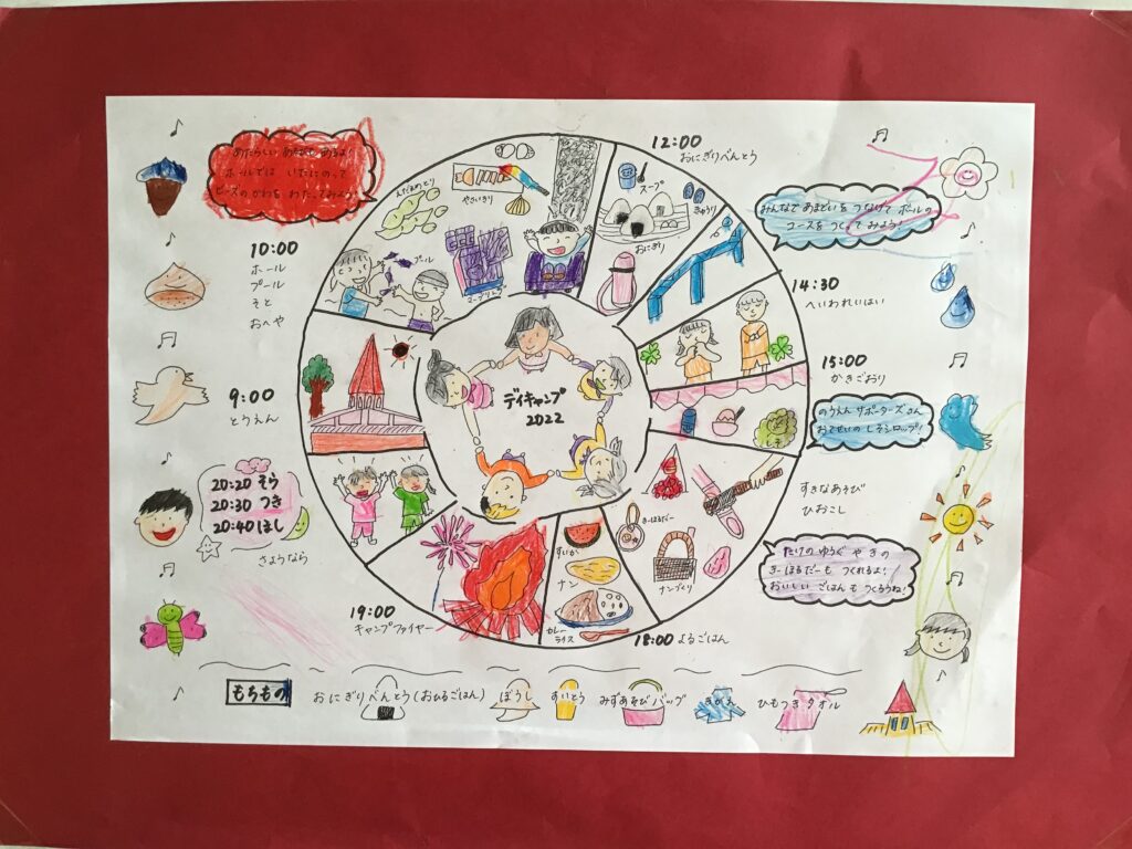 年長組は7月22日に、幼稚園で朝から夜まで遊ぶ、デイキャンプを行いました。今年度のテーマは『 わ 〜つながって〜 』友だちのわ、遊びのわ、平和のわ…様々な“わ”を、仲間と一緒につくりだし、たっぷり遊びましたよ。
