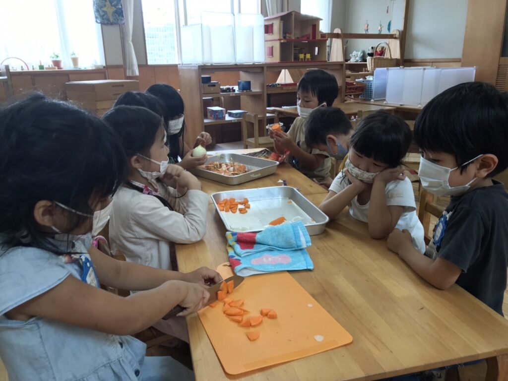 夕食に食べるカレーの材料は自分たちで切って準備しました。