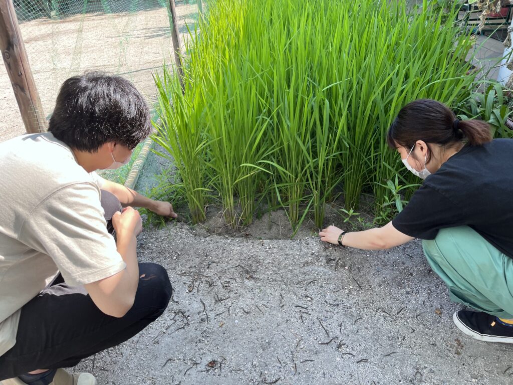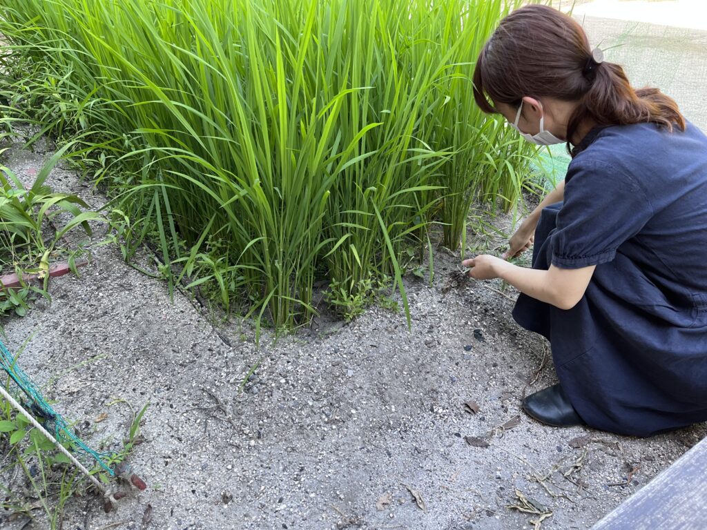 中干しの間に、水がなくてもお米は枯れていませんよ。心配なく。先生たちは水のないうちに草抜きもしています。
