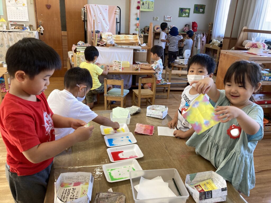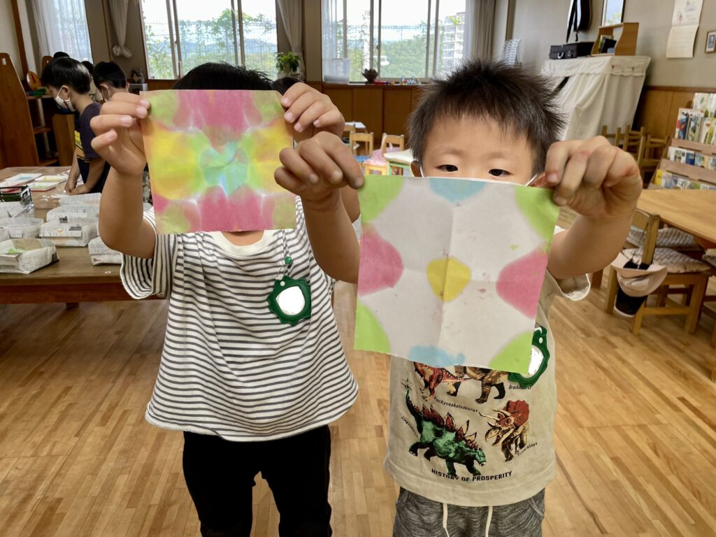 大喜びで夢中になって何枚も作る子や、折り方によって模様が変わることに気付き、様々な折り方を楽しむ子もいましたよ。