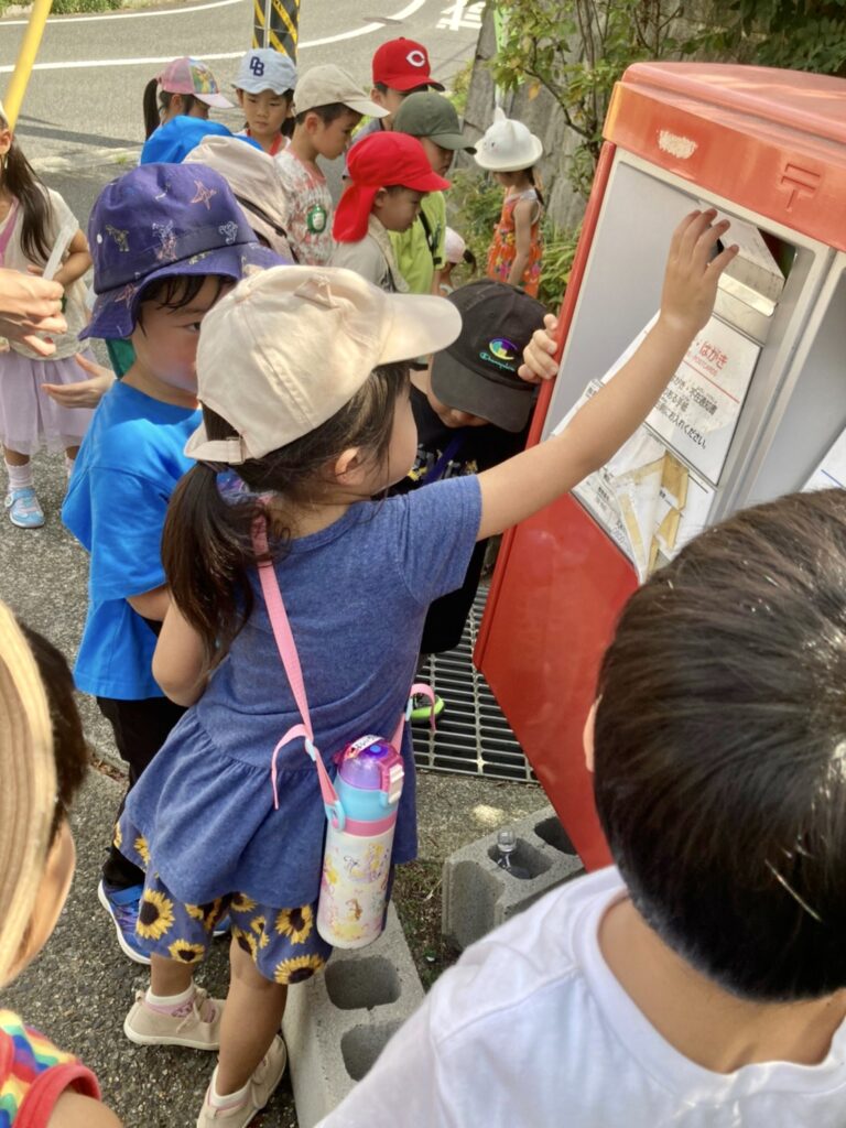 完成した染め絵の中のいくつかは、おじいちゃんおばあちゃんへ感謝の気持ちを込めてハガキに貼り、敬老の日に届くよう子どもたちとポストへ投函しました。