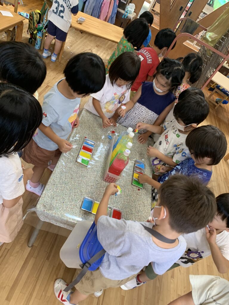 和紙を四角や三角、好きな形に小さく折って色水にチョンとつけると、じわ〜と綺麗な色が染みていきます。