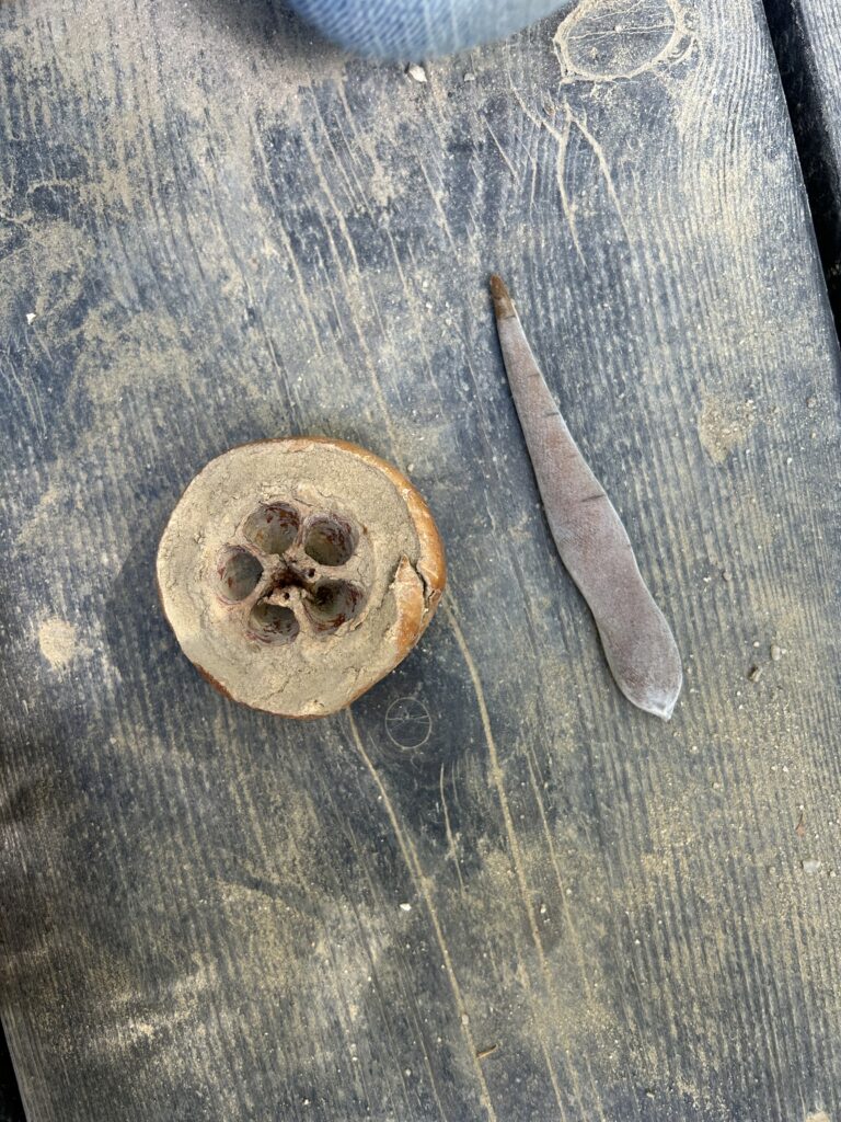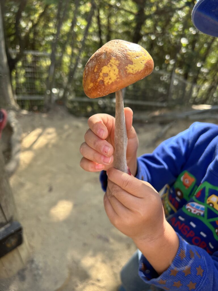 大きなキノコに驚き「え!すごい!どこに生えてたの?」と問いかけるとニヤっと笑い、「ほんとはキノコじゃないんだよ」と子どもたち。