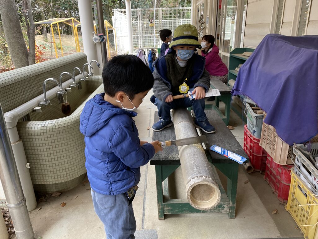太い竹は切るのに力がいりますが、友だちに座って固定してもらえれば安心です。