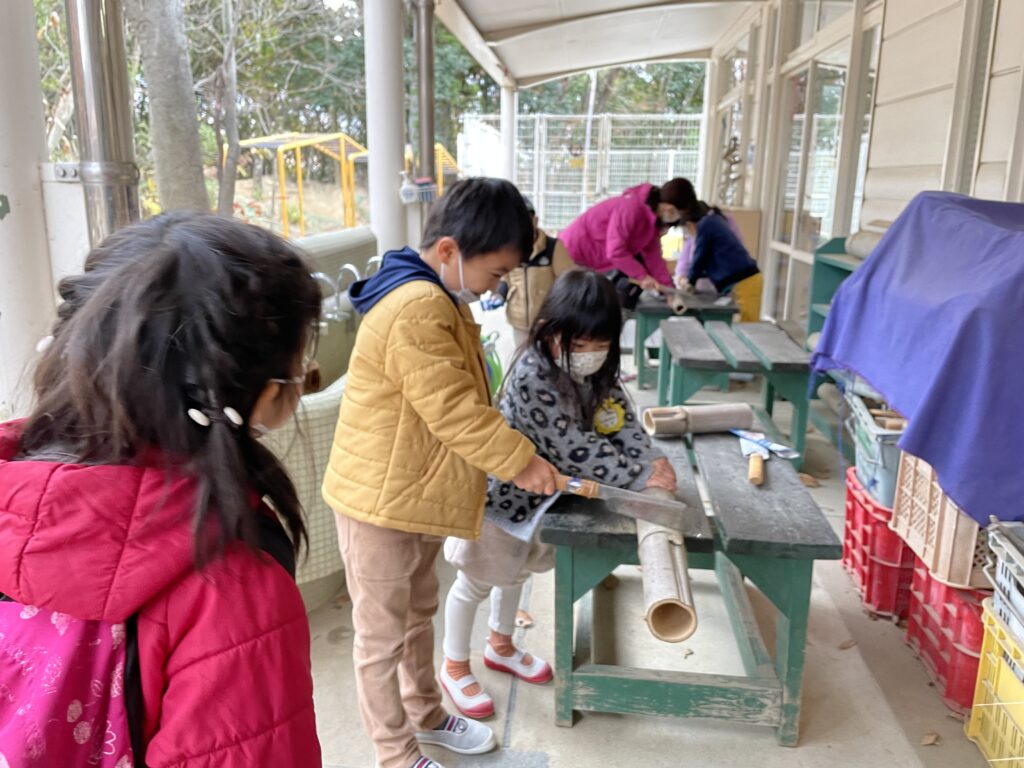 その中でもよく使われているのは竹のバケツです。バケツは水や砂を運んだり、拾った木の実を入れてカバンにしたりと年少児から年長児まで大人気!