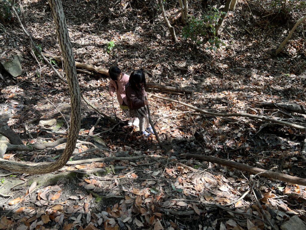 だけど今では、「せんせい、こっちからも行けそう!行ってみる!」と、自分から急斜面の難しい道を選んで、スリルも味わいながら体全体を使って森を楽しんでいる子どもたちです。
