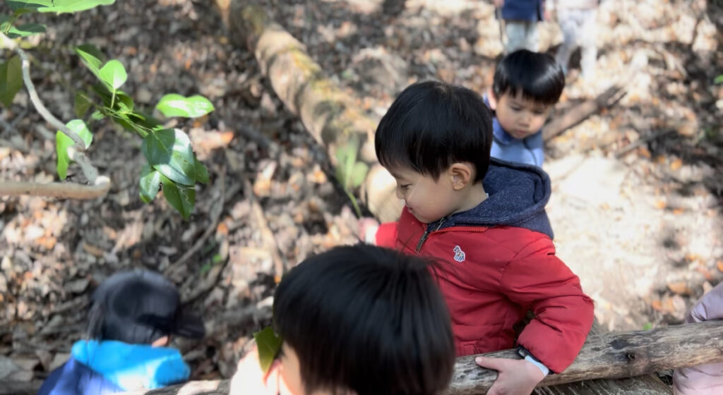 5月に初めて森に入った時は、怖くて涙が出る子どもや、登っている途中で疲れて「抱っこ」と手を伸ばす子どももいました。