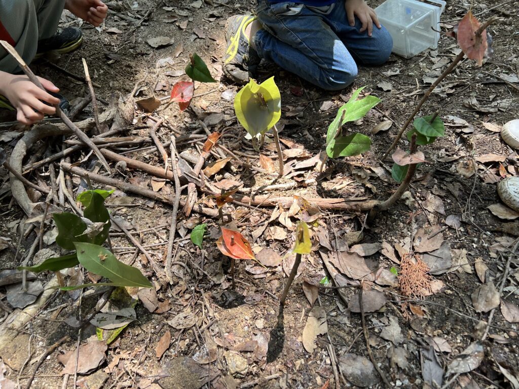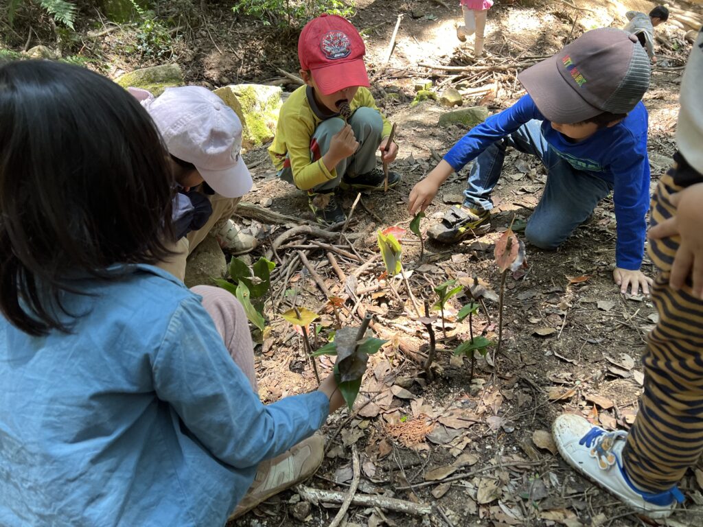 かずらの谷を流れている水の中から、葉っぱの魚を釣ってきた子どもたち。「魚釣って来たから、焚き火して魚を焼こう」「いいね!魚パーティーしようよ」手際良く、焚き火の準備をして魚を焼き始めました。
