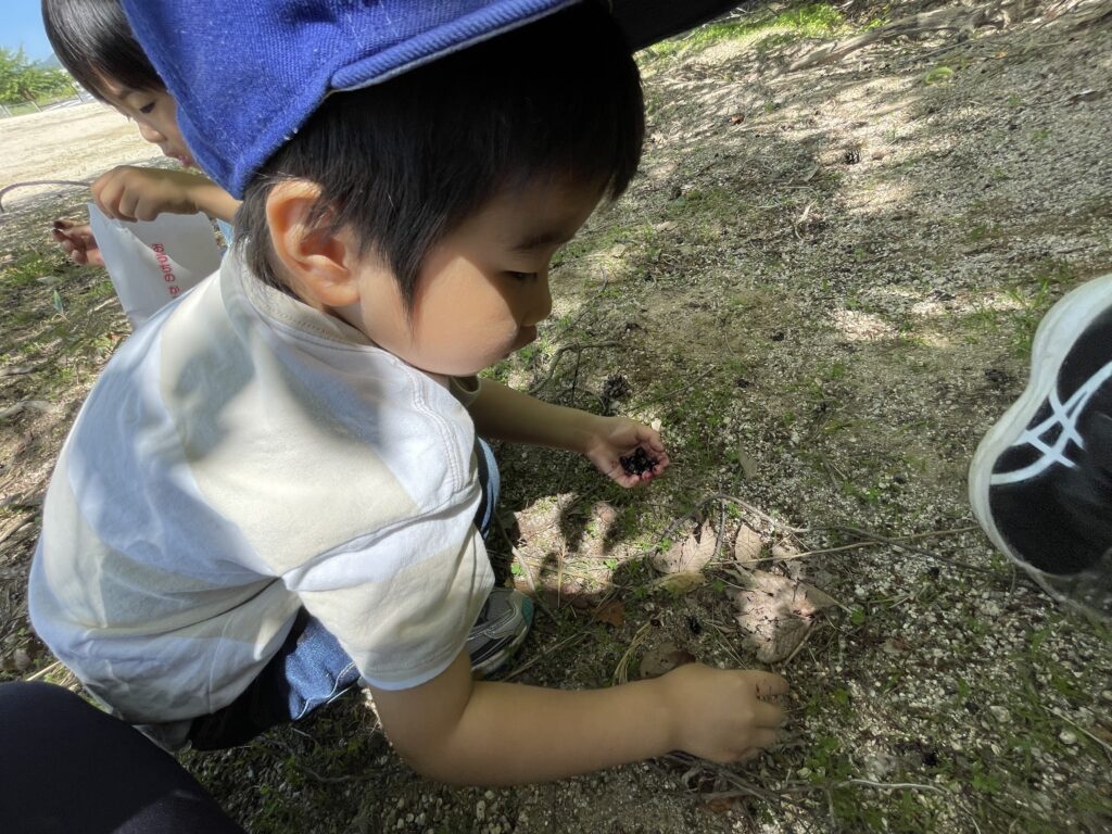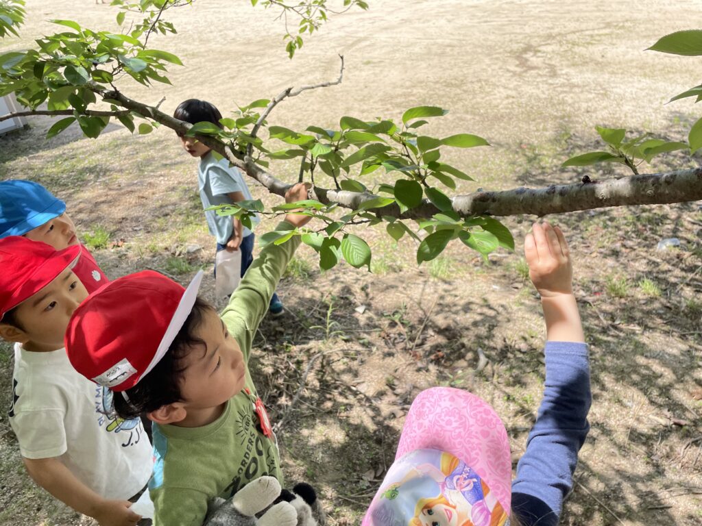 サッカーや鬼ごっこをしたり、虫探しをしてみたり、それぞれに楽しんで過ごしていると、倉庫の横にある大きな木の周りに集まっている子どもたちの姿がありました。