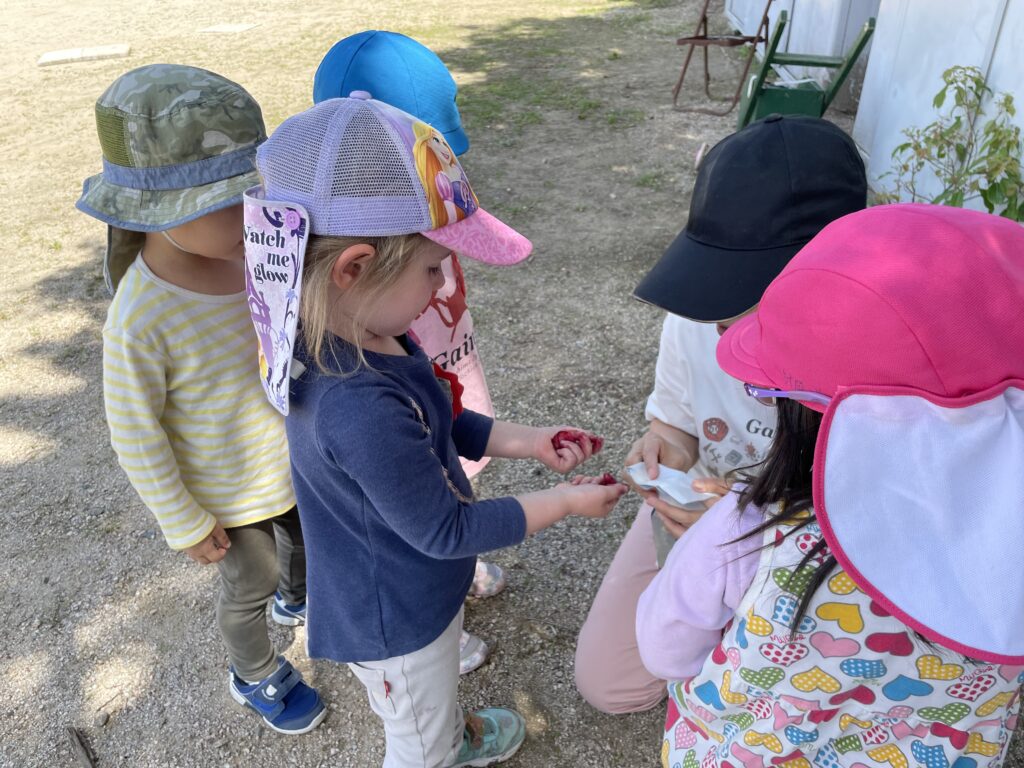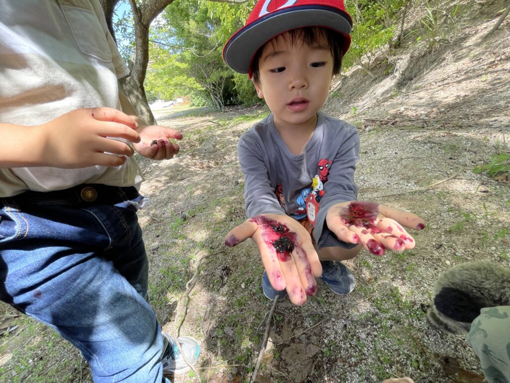 子どもたちにとっては、手が紫色に染まる事も楽しかった様で他の遊びをしていた子どもや先生にもご紹介。