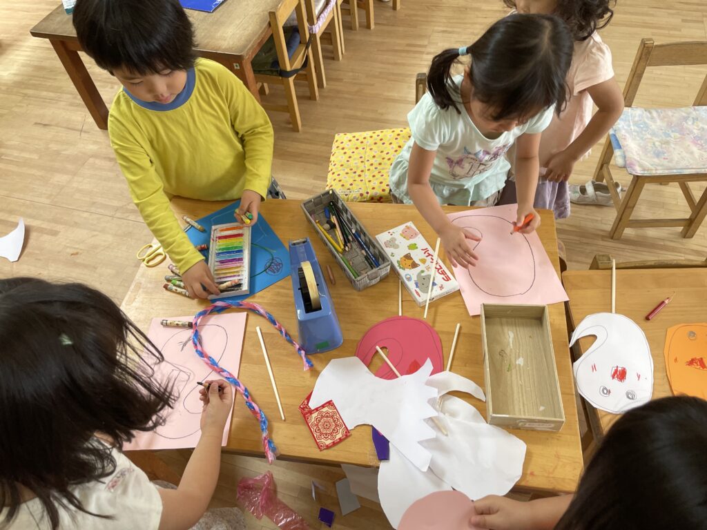 ところが、保育室に帰ってみるとオバケはどこかにおでかけかな?姿が見えないぞ。そこで、オバケの仲間を自分たちで作ってみることにしました。