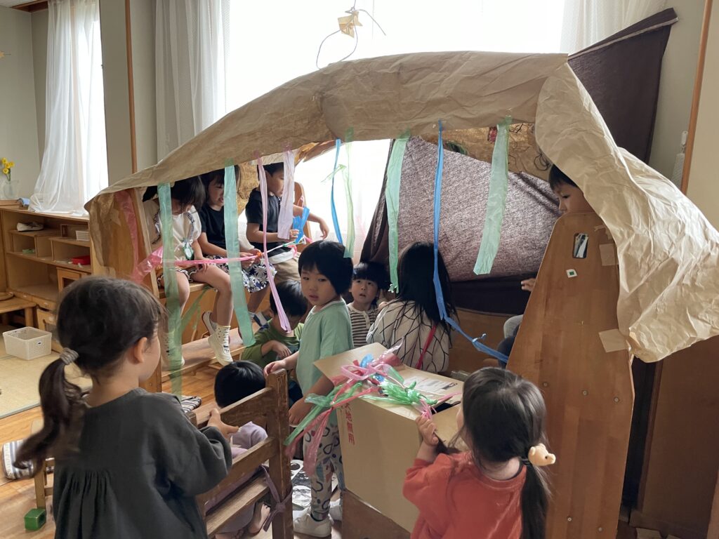 作ったオバケでごっこ遊びが展開され、たっぷり楽しんだ後に「おばけやしきつくろうよ!!」と友だちを誘ってお化け屋敷作りに取り掛かりました。