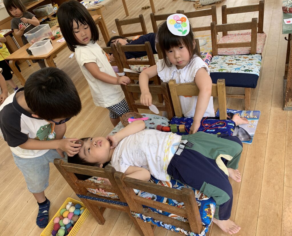 最初は人形が患者になっていたけれど、「倒れちゃったよ、、」「熱があるかも、、」と子どもたちも患者になって、、、