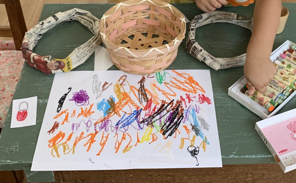 周りの子が「薬できたよ」とクレヨンで描いて持ってきてくれて、人形にお薬を飲ませて、病院ごっこが始まりました。