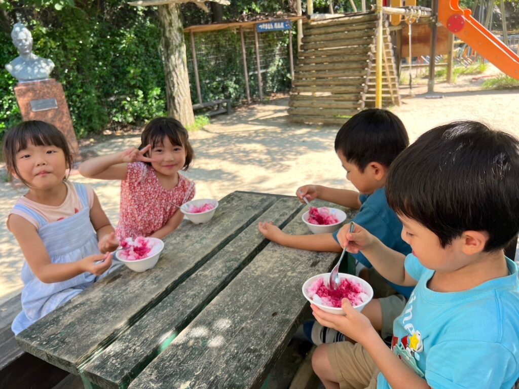 おやつはゲーンス農園サポーターズさんに作っていただいたおいシソシロップのかき氷。暑さを吹き飛ばす最高の美味しさ!