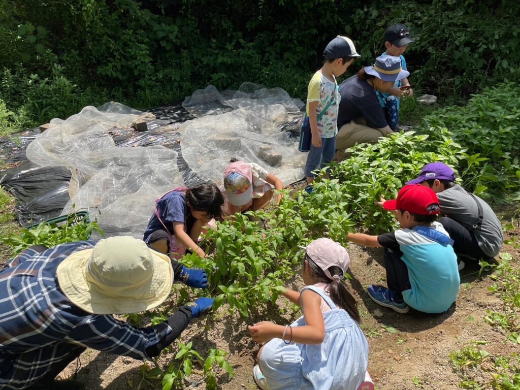 【チームそら組】ゲーンス農園へ行き、春から育てた藍を刈り取りました。2学期に行う藍染めが待ち遠しいね