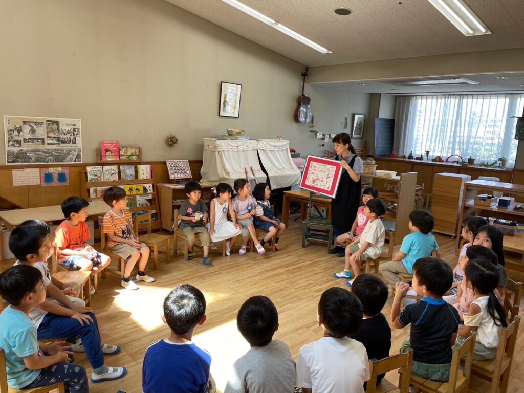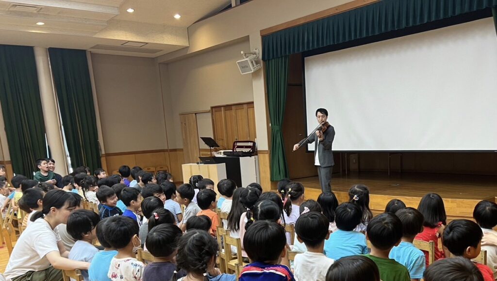3クラスみんな集まってホールで平和礼拝。礼拝の中で戦争のこと、原子爆弾の脅威について知る時を持ち、広島女学院へ寄贈されたパルチコフさんの被爆バイオリンの音色を通し平和をつくり出すことへの思いを馳せることができました。礼拝のお話、被爆バイオリンの演奏は年少ひよこ組担任の白石先生。