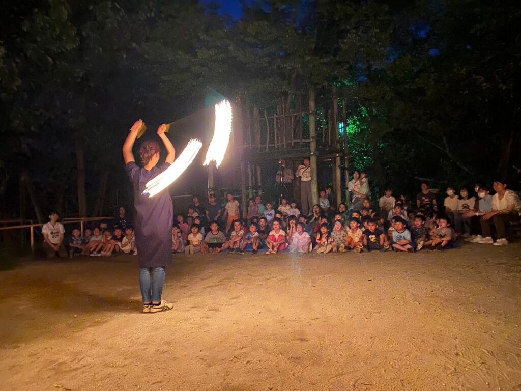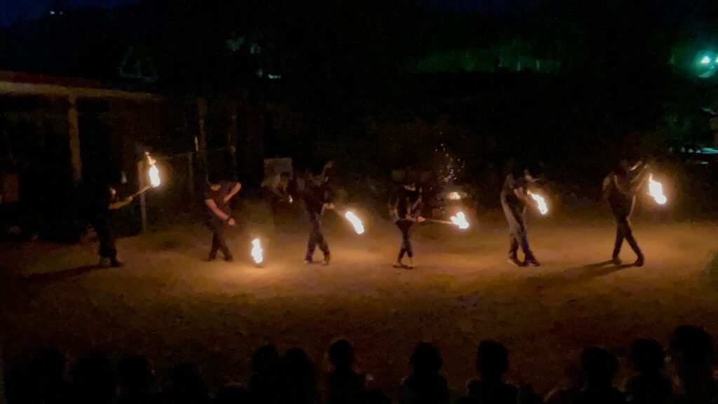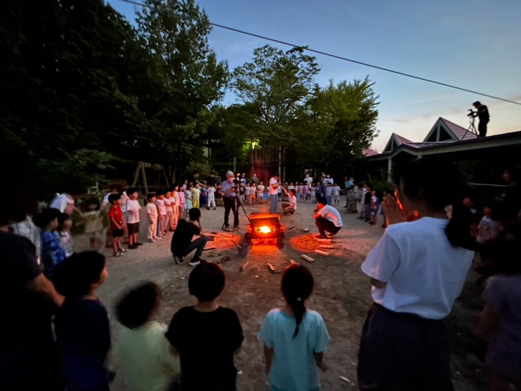 夜はみんなで火を囲んでキャンプファイヤー