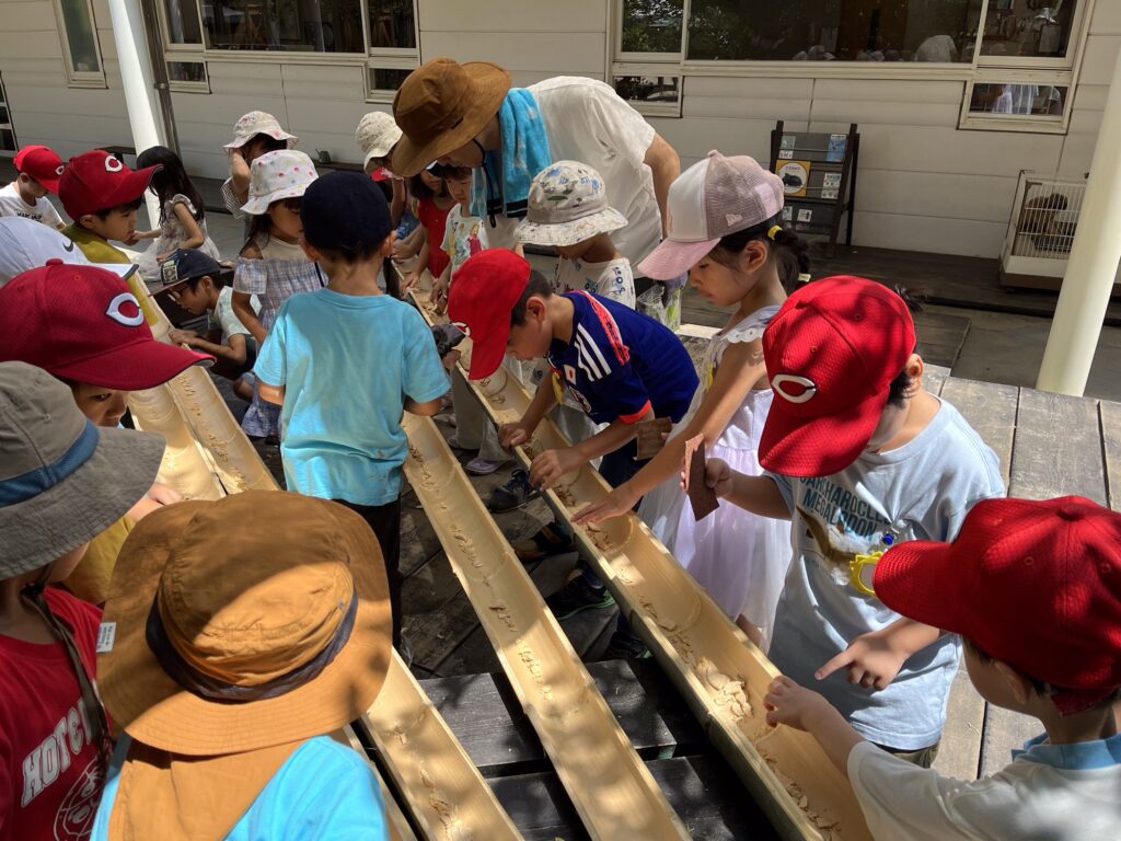 【チームつき組】「すべすべになったかな?」と流しそうめんで使う竹の節を紙やすりで削っていきました。
