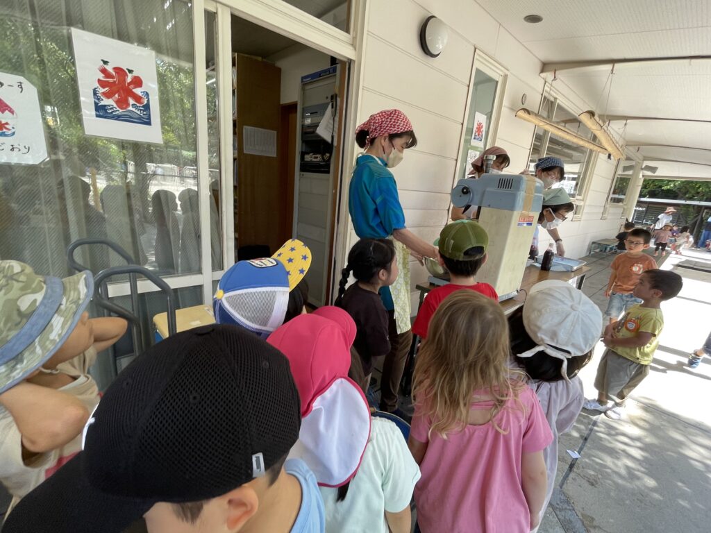 待ちきれないでかき氷機をのぞき込むと・・・「あれー、不思議!透明の氷、どうして削ると白くなるの???」