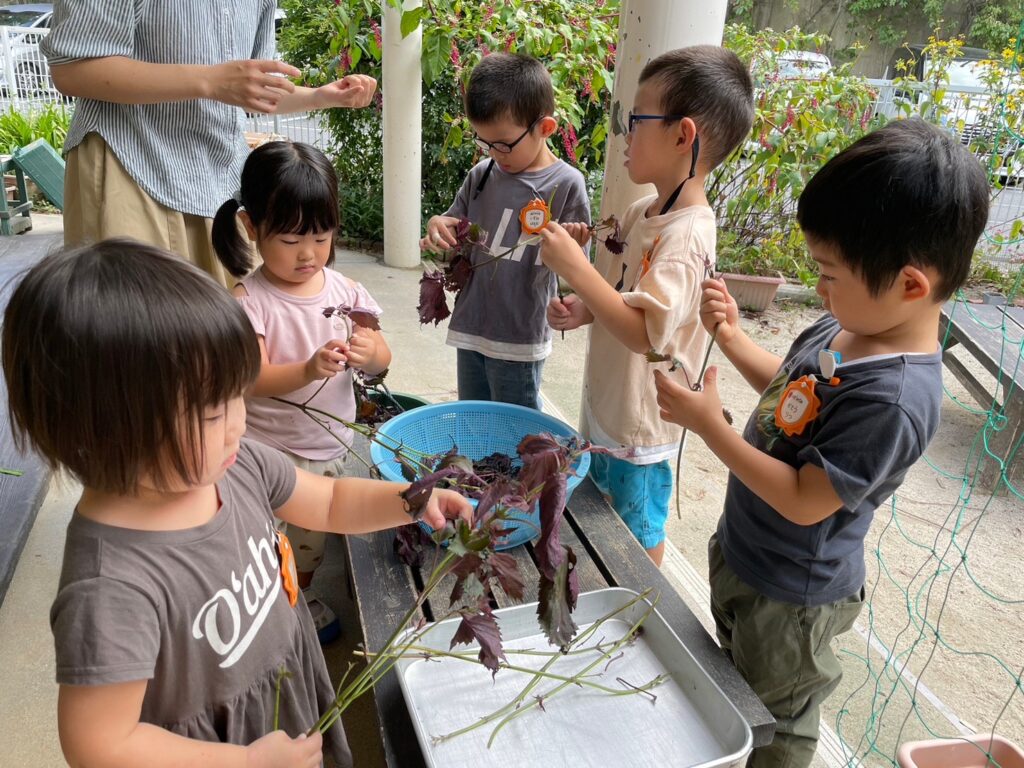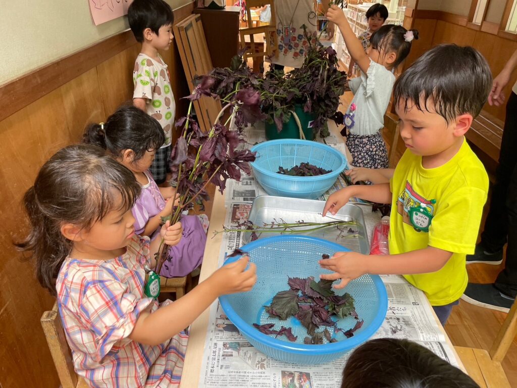 今年はゲーンス農園の赤しその発育がゆっくりだったため、職員の自宅の畑や「とれたて元気市さん」の赤しそも加えてシロップづくりをすることにしました。