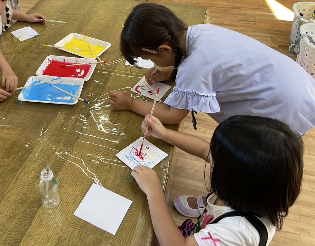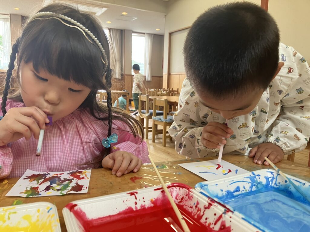 今年はハガキに、子どもたちが幼稚園で楽しんだ、吹き絵とにじみ絵の作品を貼ることにしました。