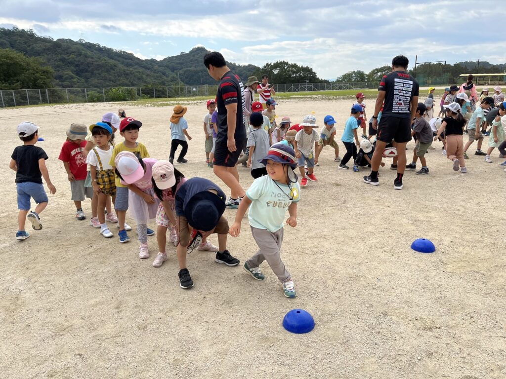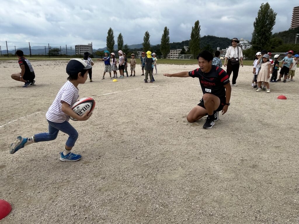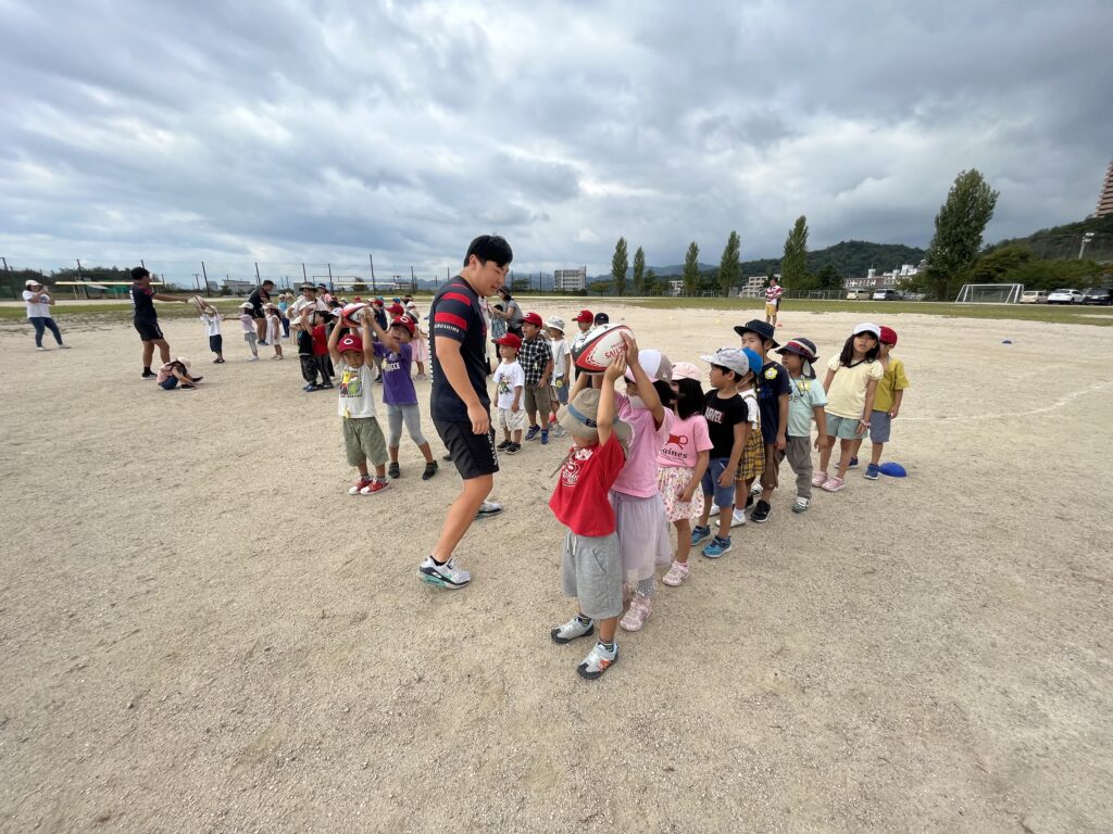 最近、園庭でバスケットボールやラグビー、サッカー、野球などのスポーツが流行っている年長組。この日はグラウンドに行ってラグビー体験をしました!