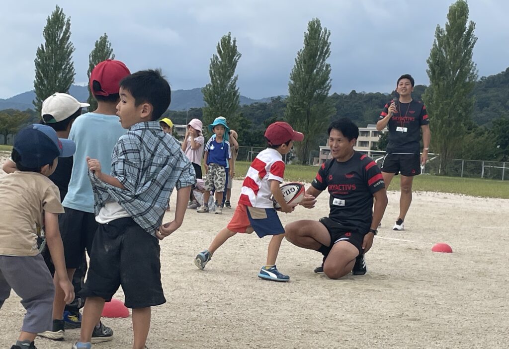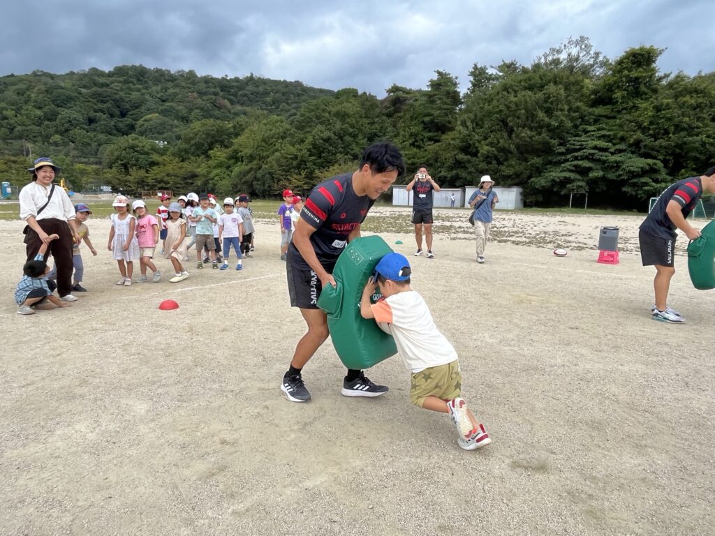 そして何といってもラグビーといえば、タックル!!本物のタックルを見て「おおおお!」歓声を上げ感動する子どもたち。