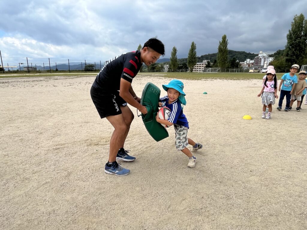 コーチはご挨拶の中で「ラグビーは足の速い人も、体が大きく力持ちの人も、それぞれの得意なことを生かしながらできるスポーツなんだよ。」と説明して下さり、ぐん!とみんなの興味が深まりました。誰にだってできる、誰もが楽しめる。そんな感覚を持って始まったラグビー体験。