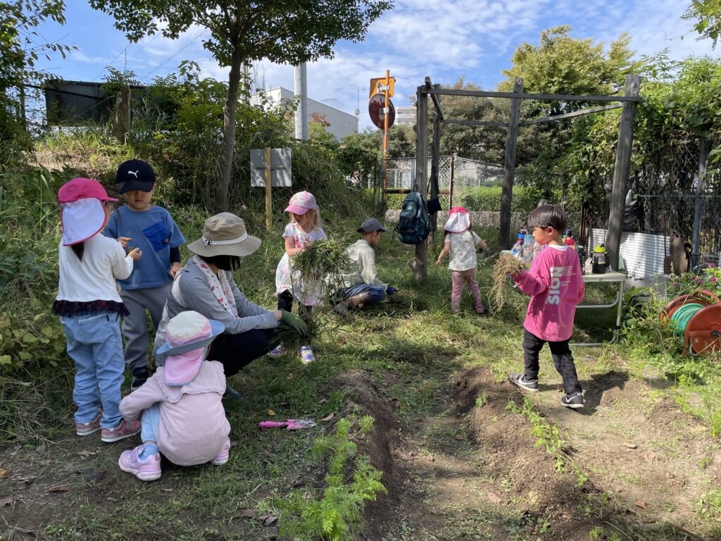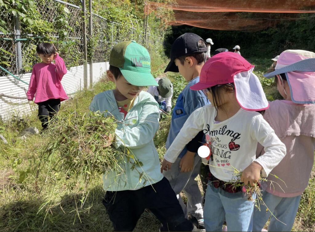 農園サポーターのお母さんたちに教えてもらいながらたくさん草をとり、子どもたちの手の中には沢山の草でいっぱいです。