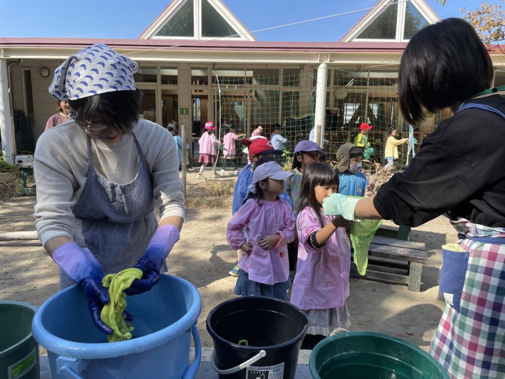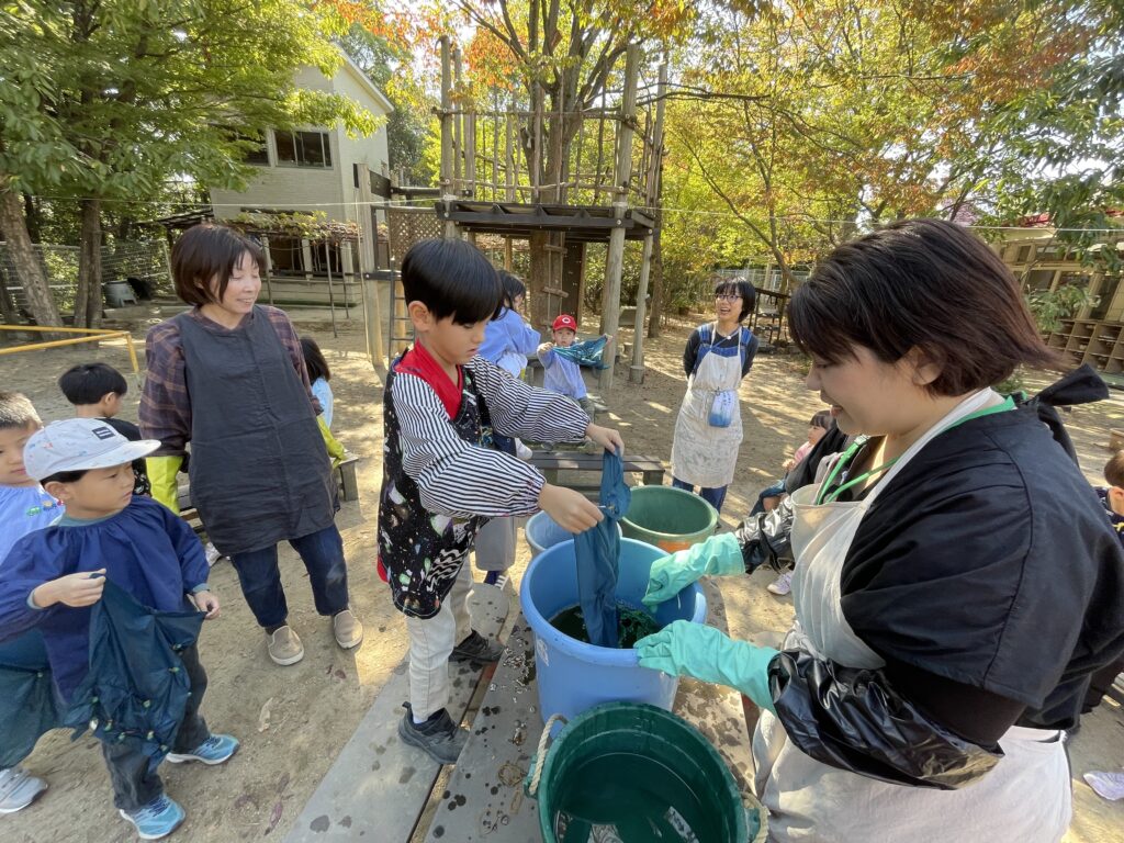 青空の下、染物名人さんたち、あゆみの会のお母さんたちと輪になって、一緒に染めましたよ。