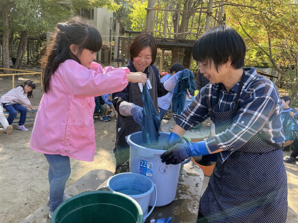 昨年度の年長さんから引き継いだ藍の種。春に種を植え、夏には藍の葉を刈り取り、刈り取った葉っぱを乾燥させて秋を迎え、本日いよいよ心待ちにしていた藍染めです。