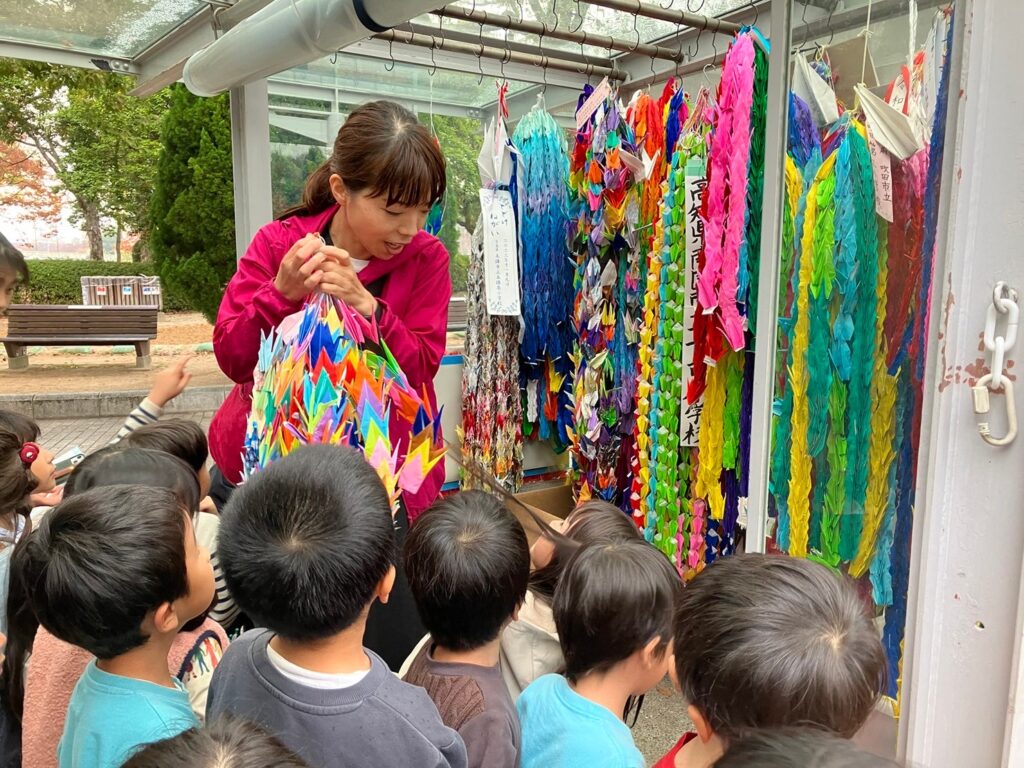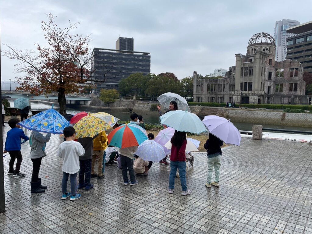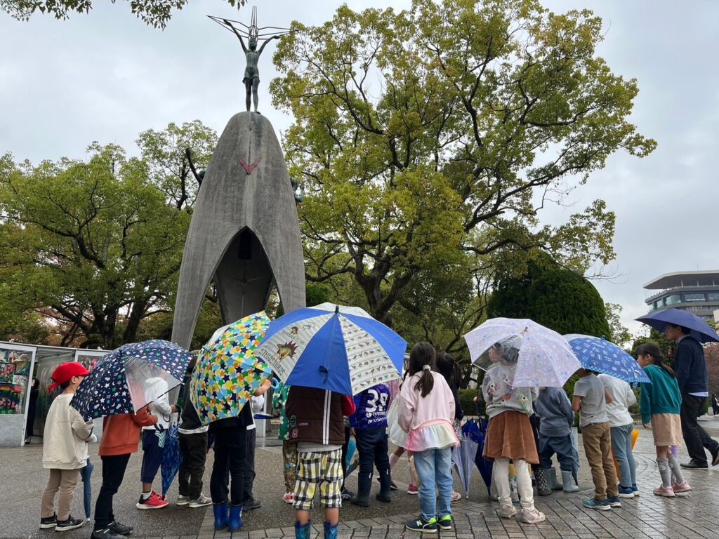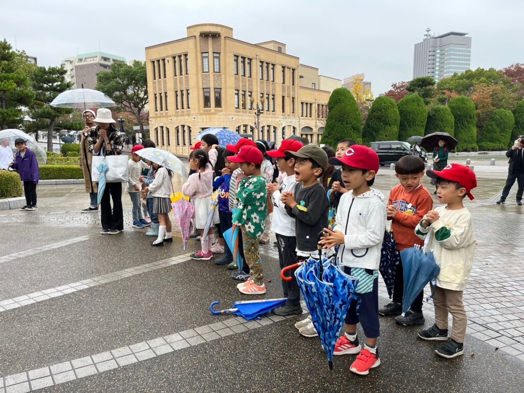 小さな雨のしずくを受けつつ、年長組の子どもたちと共に一人ひとりの平和への願いを持って『原爆の子の像』と出会ってまいりました。