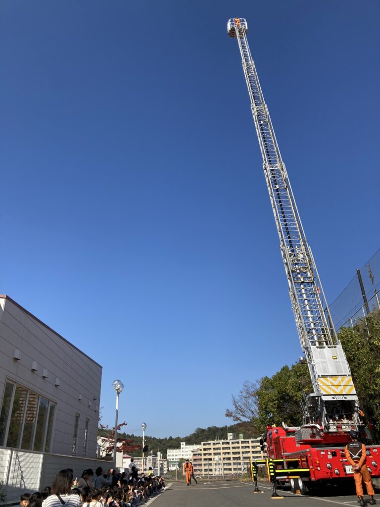 今回の訓練では、実際に消防士さんに来ていただき、避難の仕方を教えてもらったり、目の前で消防車が動くところを見せていただいたりしました。