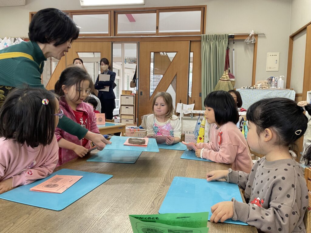 実際に使う土粘土を見たり触ったり初めて触れる土粘土に興味津々です。