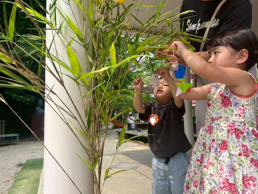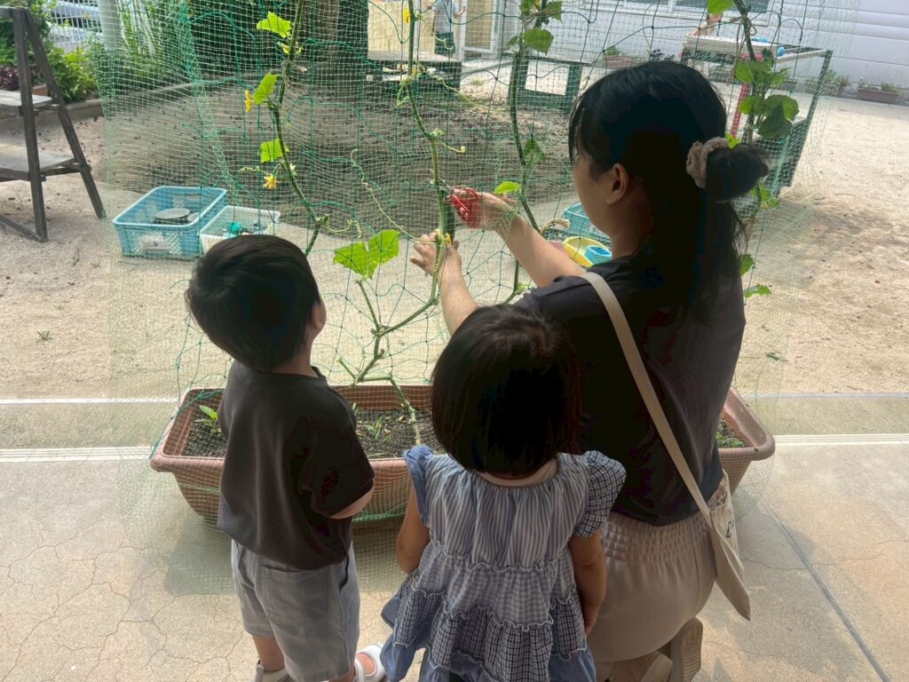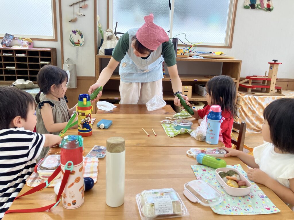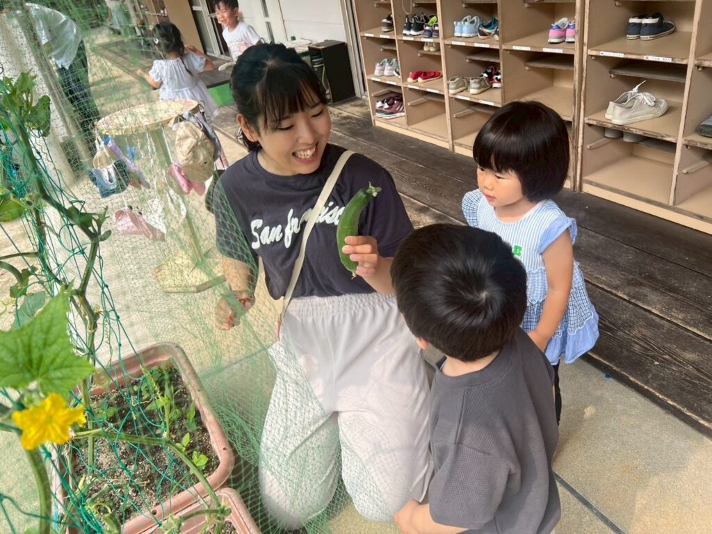 年少組さんが春に植えたきゅうり。ぐんぐん、ぐんぐん大きくなって、たくさんのきゅうりができました。満3歳の子どもたちもきゅうりを分けてもらいましたよ。