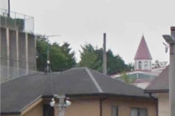 赤いとんがり屋根の幼稚園園舎が見えてきます。