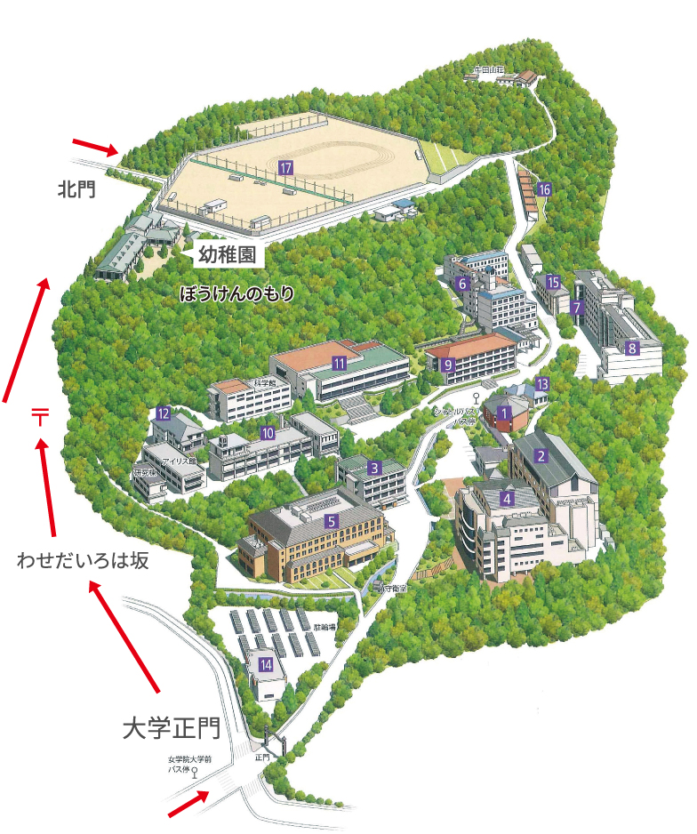 キャンパス内の坂道を15分ほど歩いていただくことになります。