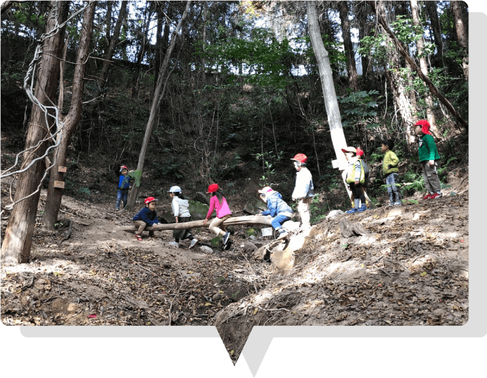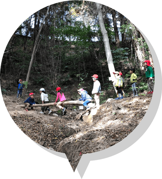 大学キャンパスの雑木林、園児たち“ぼうけんのもり”と呼んでいる空間は、昼間は子どもたちが遊び、夜になるとイタチやテン、タヌキやイノシシ、アナグマやキツネたちが暮らしている森です。牛田山にもつながっています。