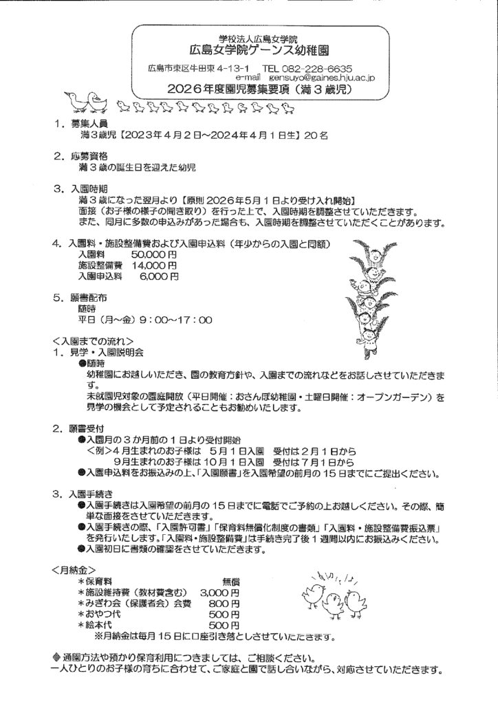 電話(082-228-6635)、メール(gensuyo@gaines.hju.ac.jp)、事務に直接問い合わせ、いずれかの方法でご連絡いただければ対応させていただきます。